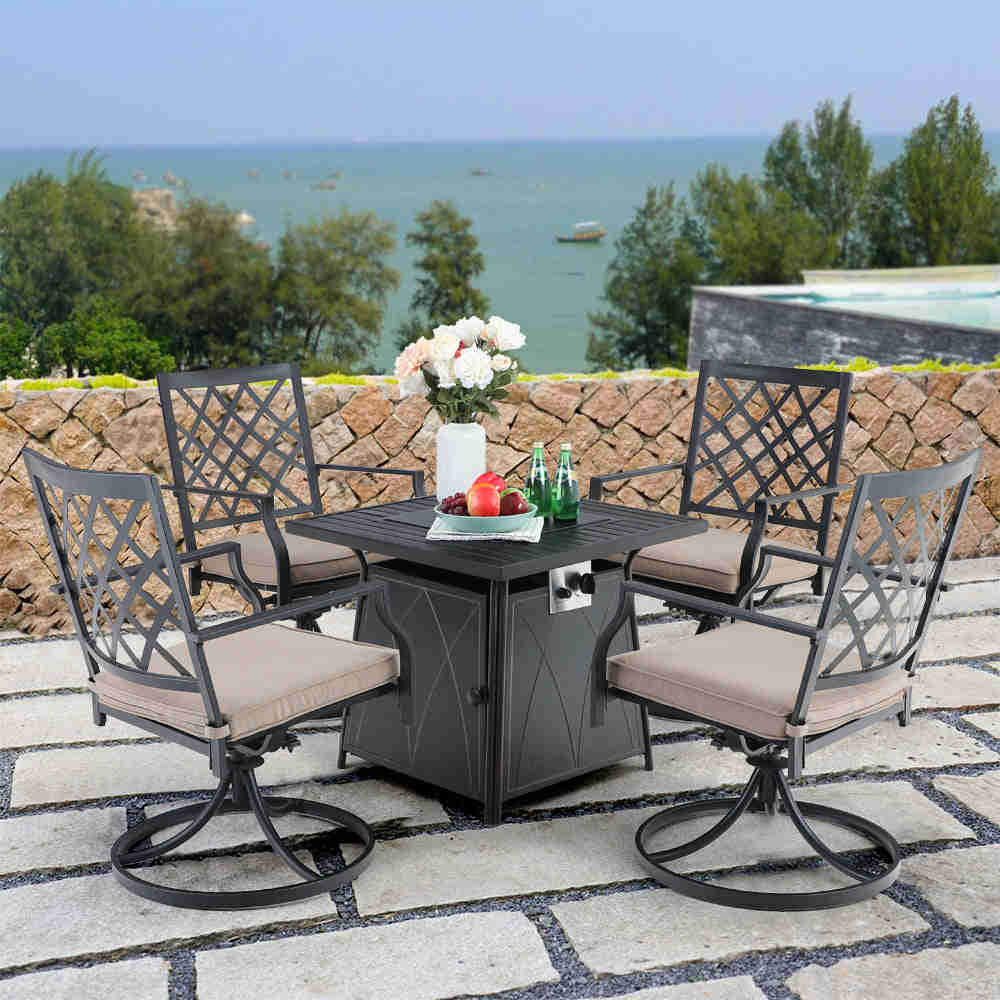 PHI VILLA 5-Piece Black Gas Fire Pit Table Outdoor Patio Dining Set with 4 Swivel Cushioned Chairs
